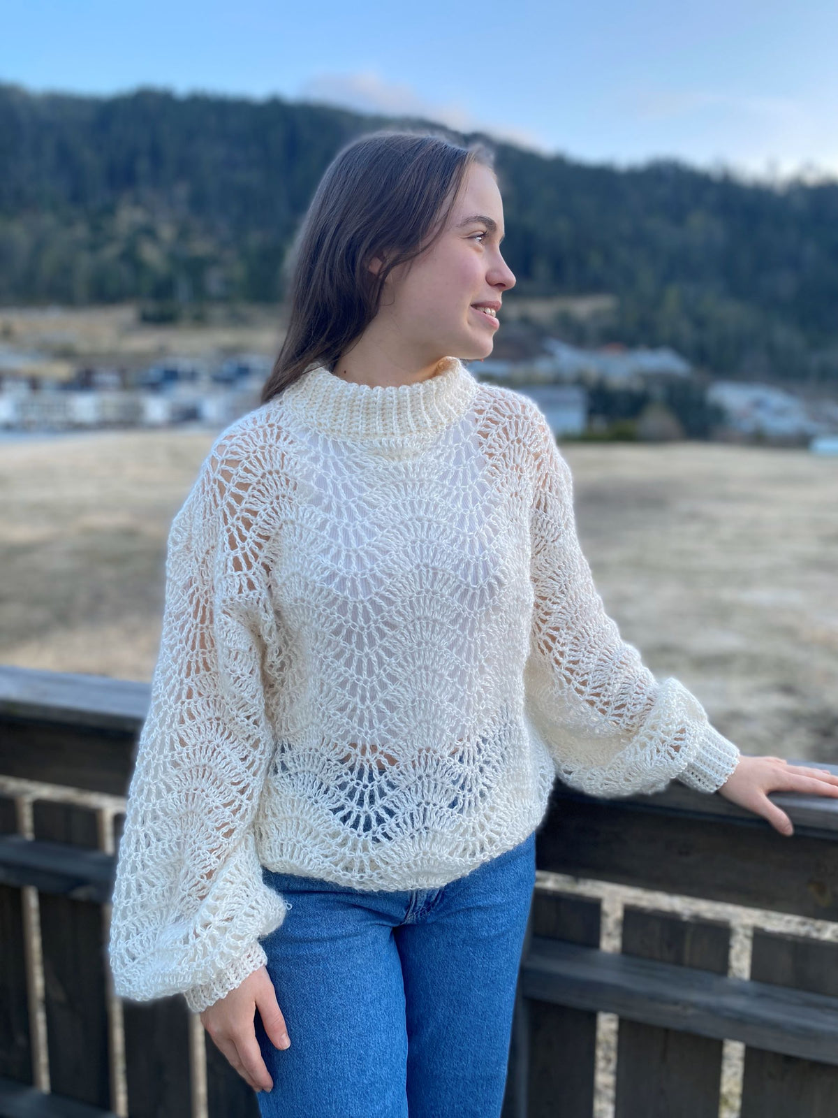 Louise genser er et elegant plagg med lekre bølgemønstre og vid passform. Den kombinerer luftige hekleteknikker med mykt garn, og gir en genser som føles lett, men samtidig varm og behagelig å bruke.