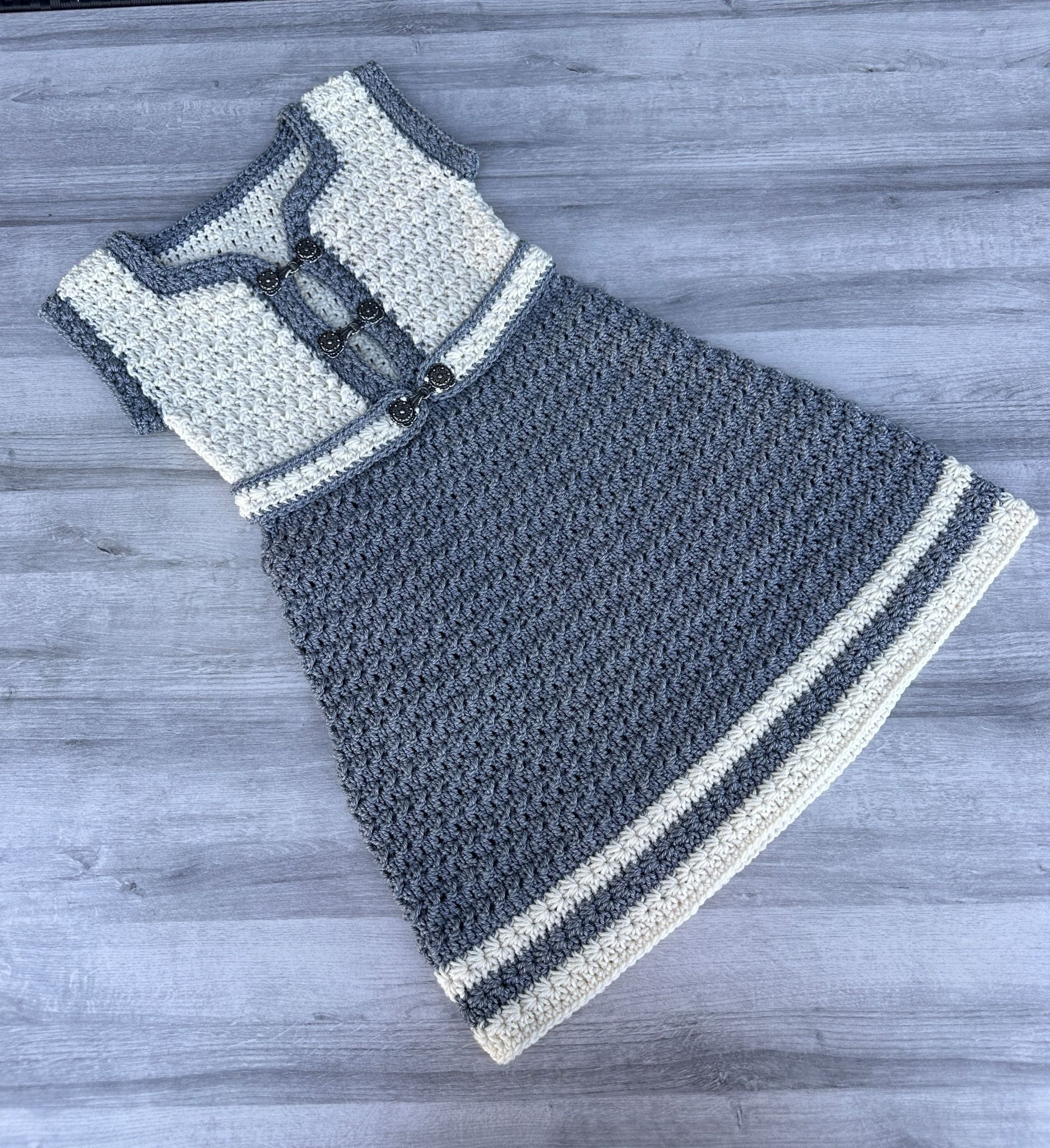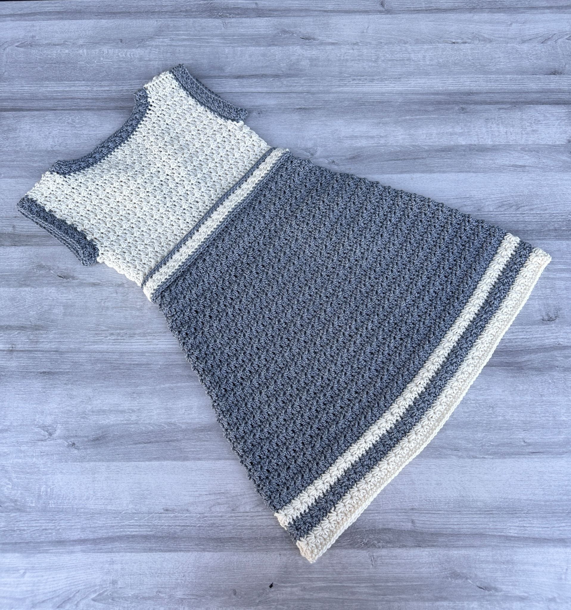 Et nydelig festantrekk for jenter, heklet med et elegant boblemønster kombinert med stjernemønster. Denne kjolen gir en sjarmerende og leken stil, perfekt for spesielle anledninger.