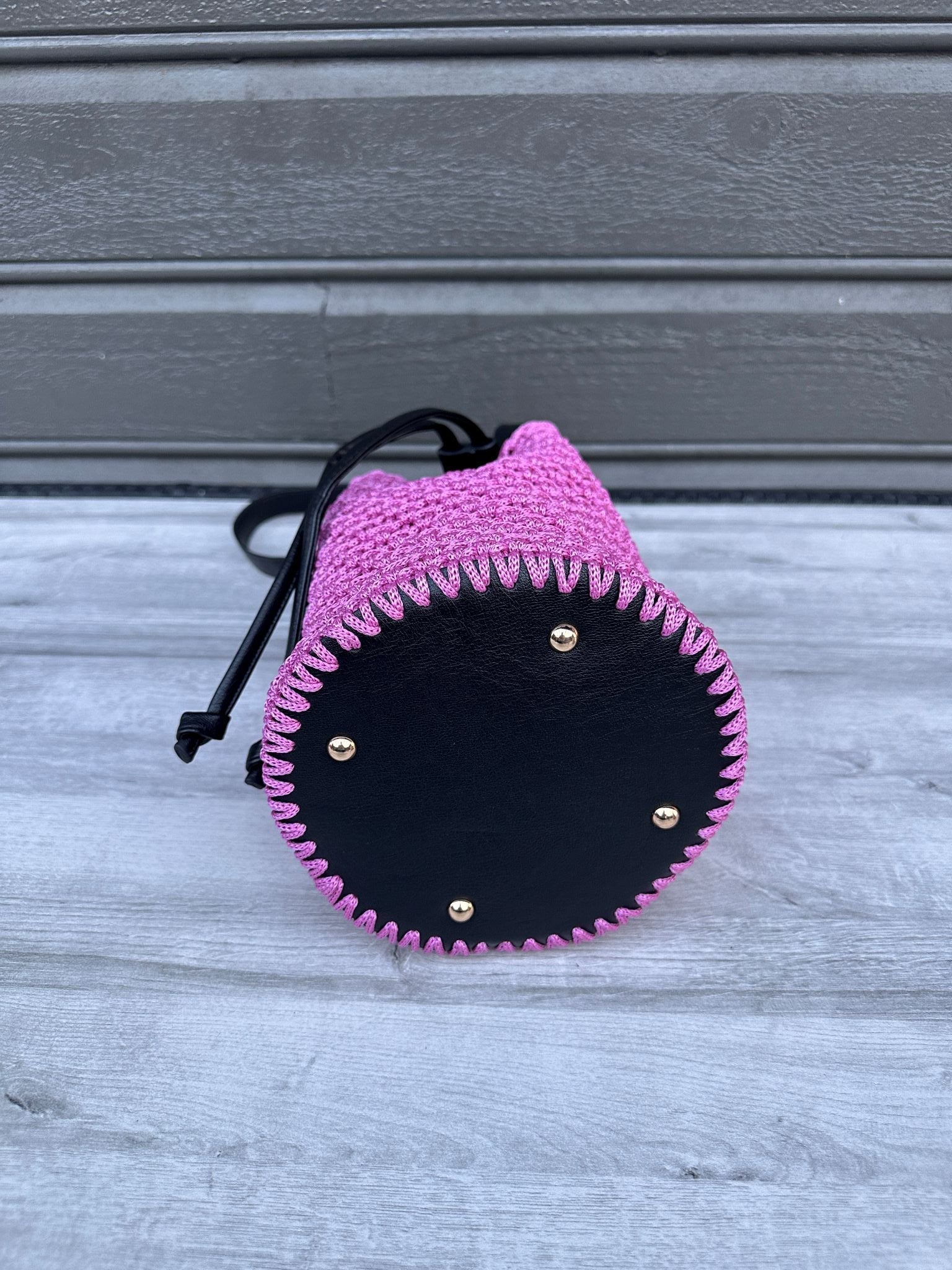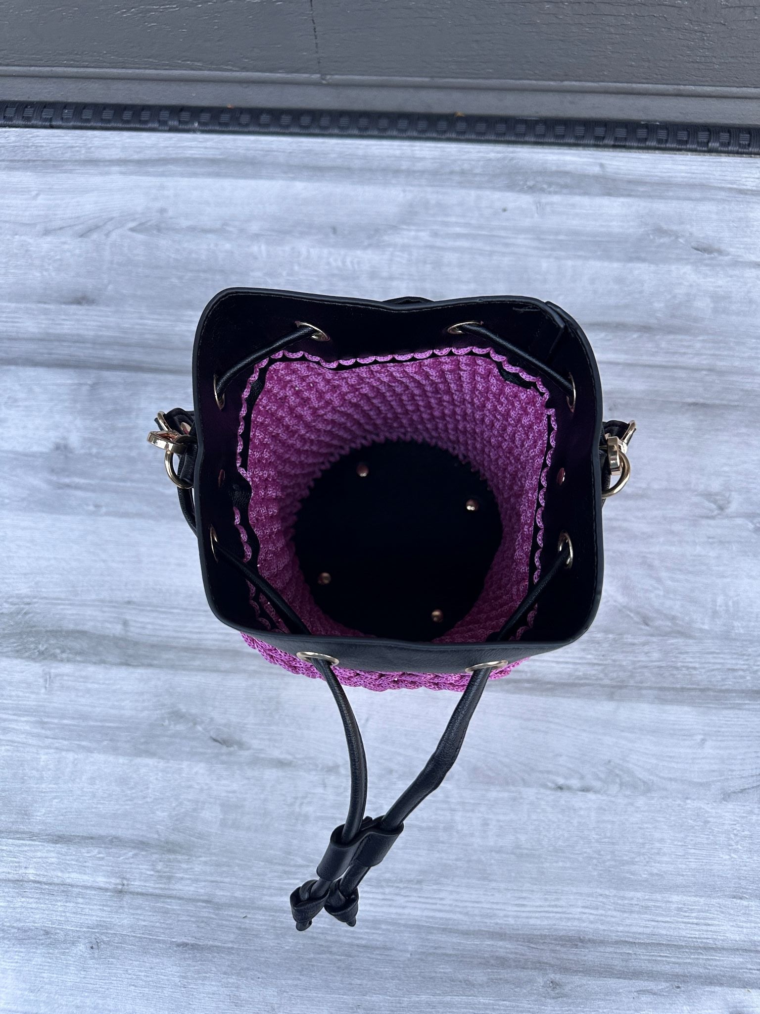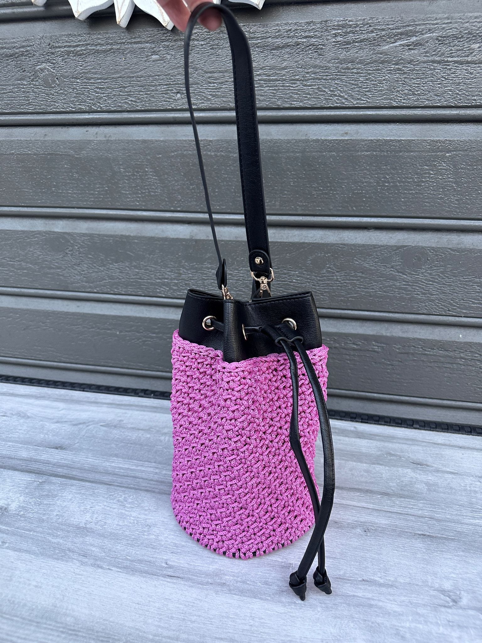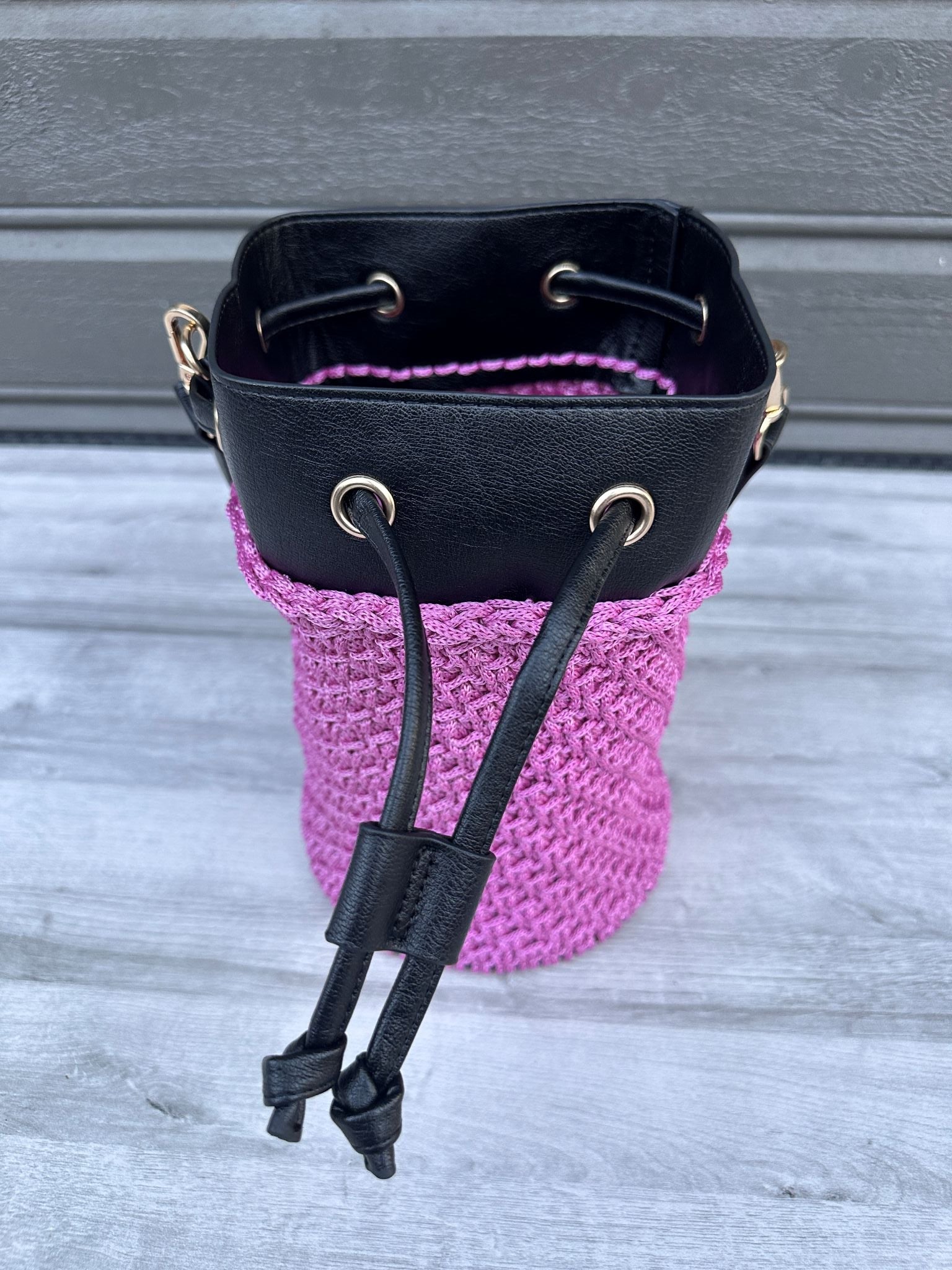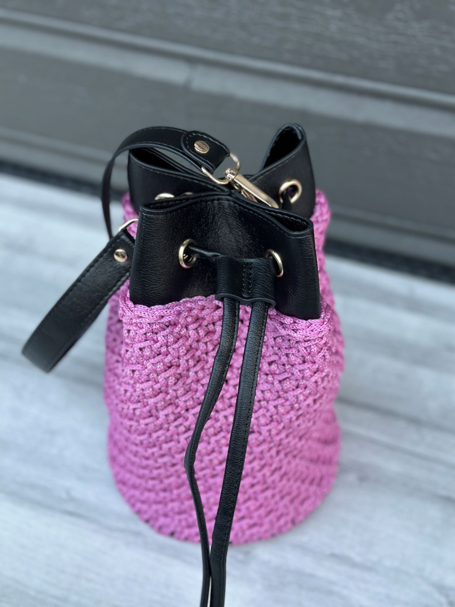 Kombinasjon av heklet struktur og svarte skinndetaljer for et eksklusivt preg