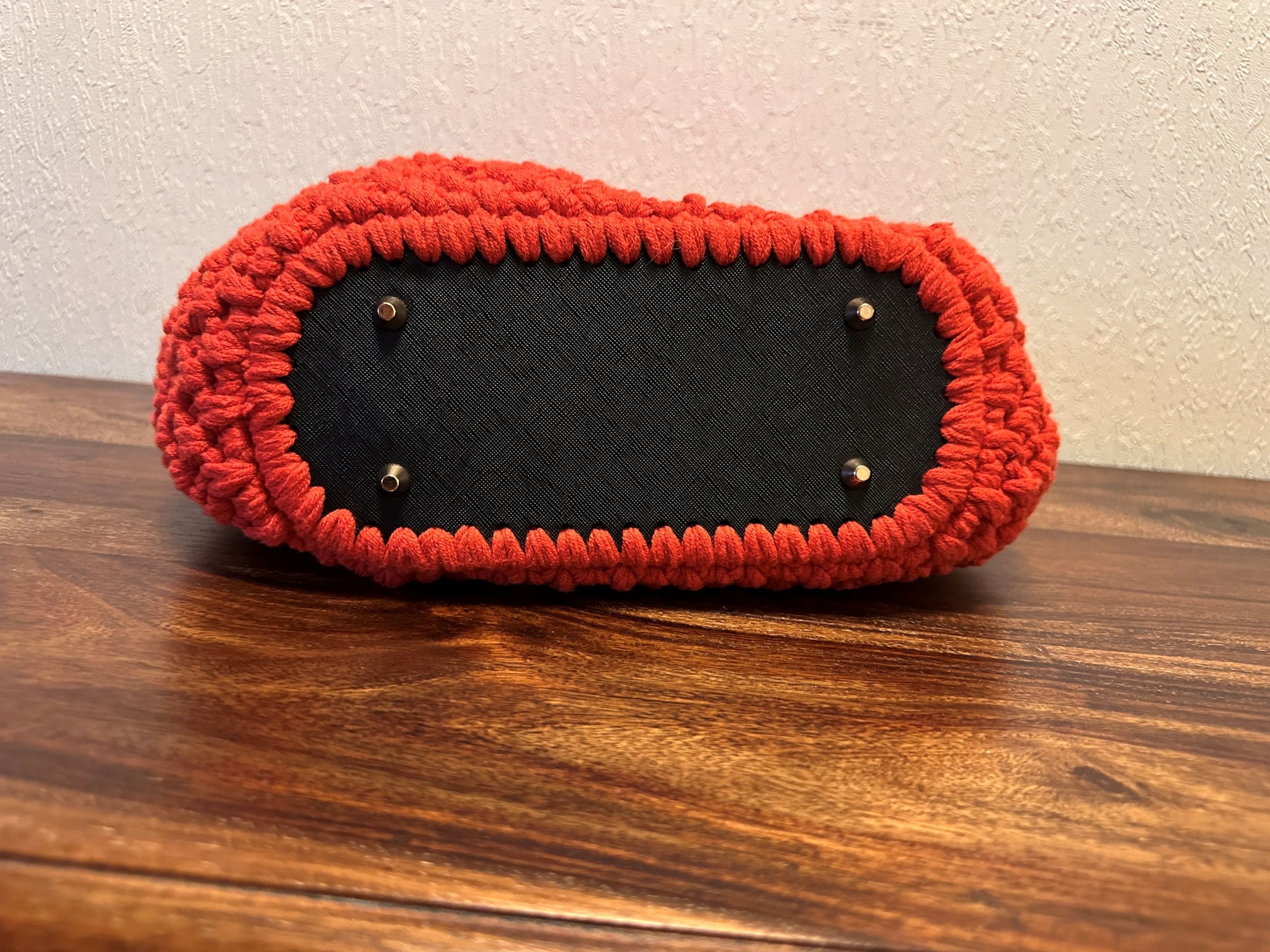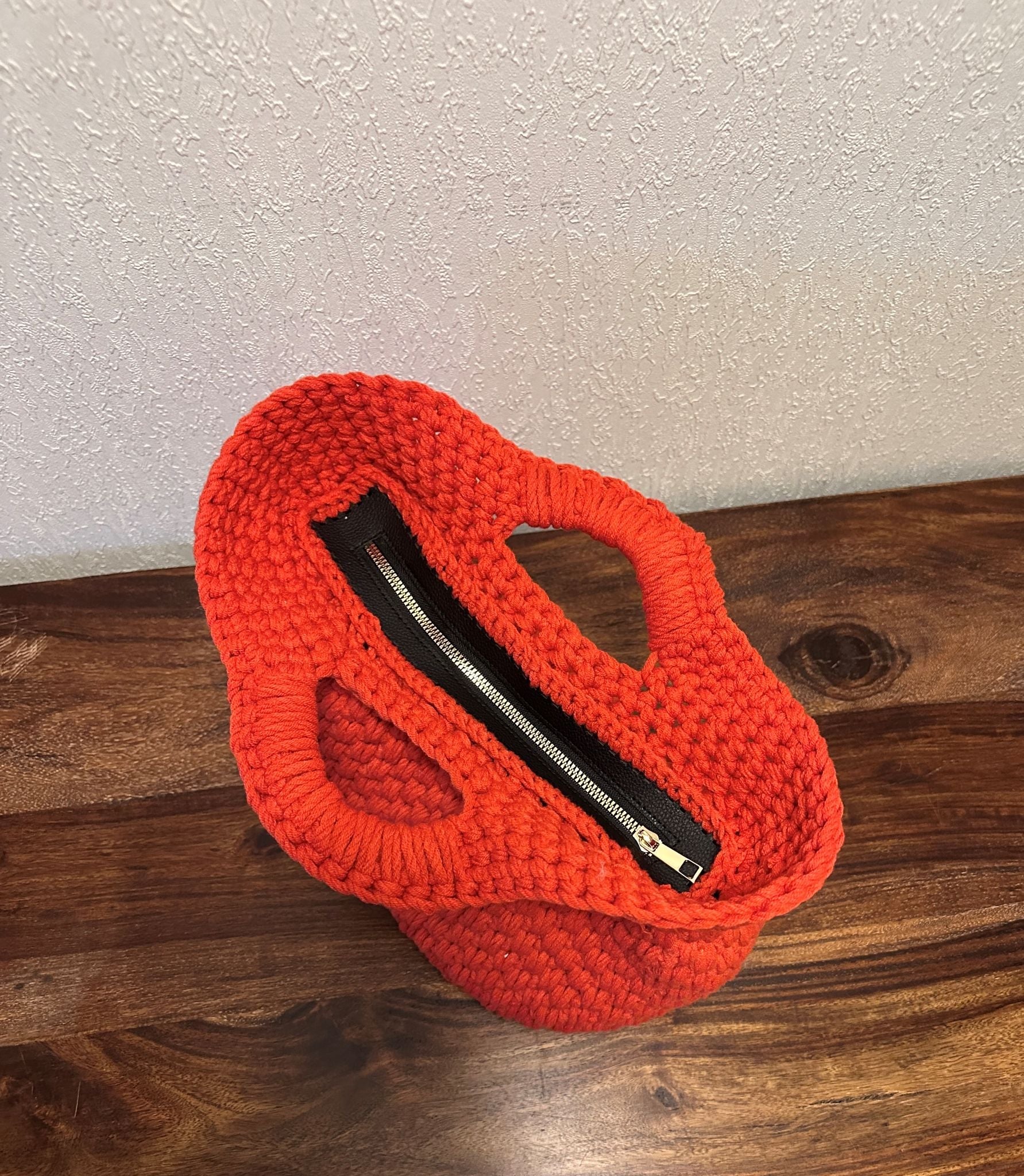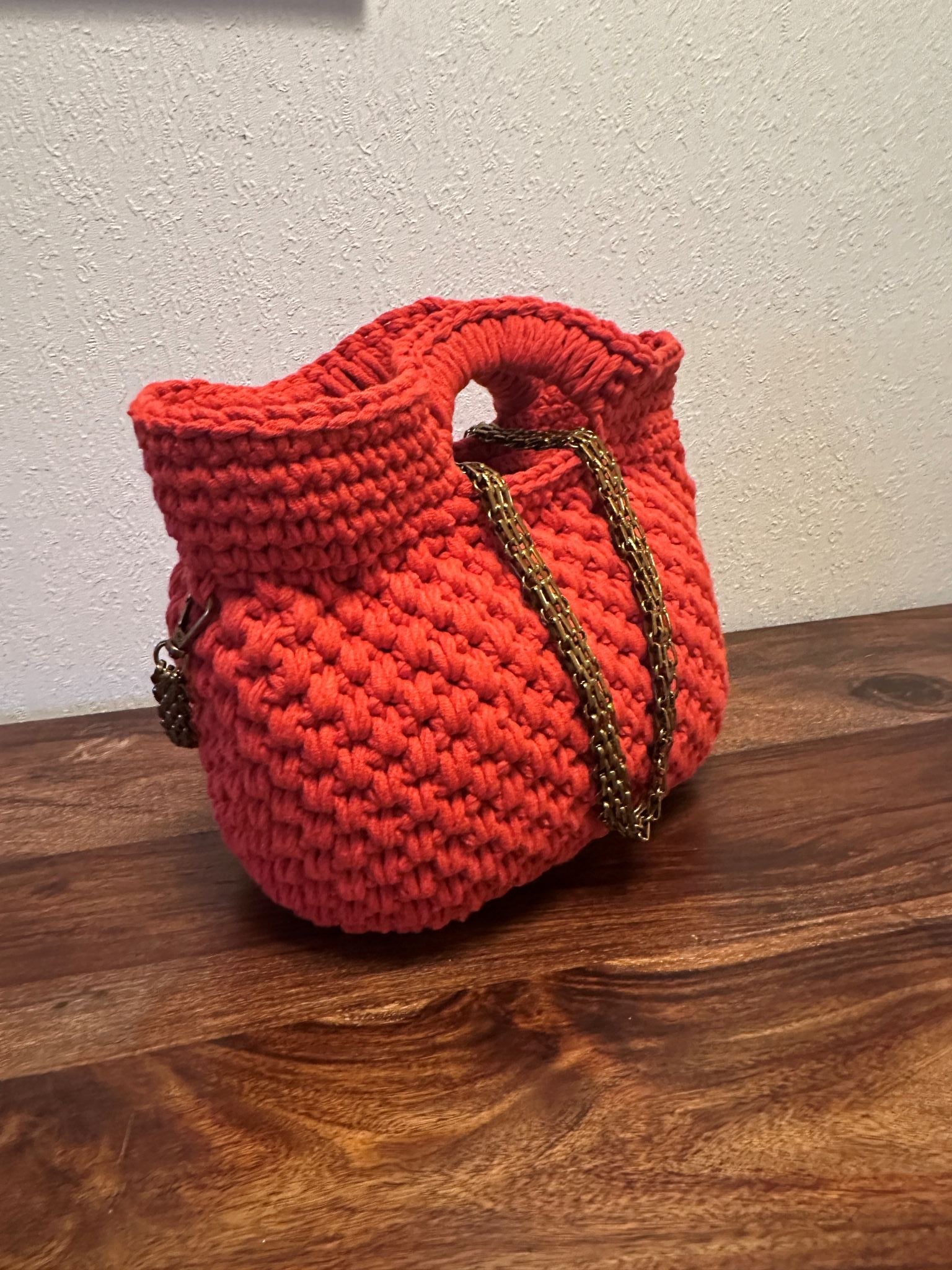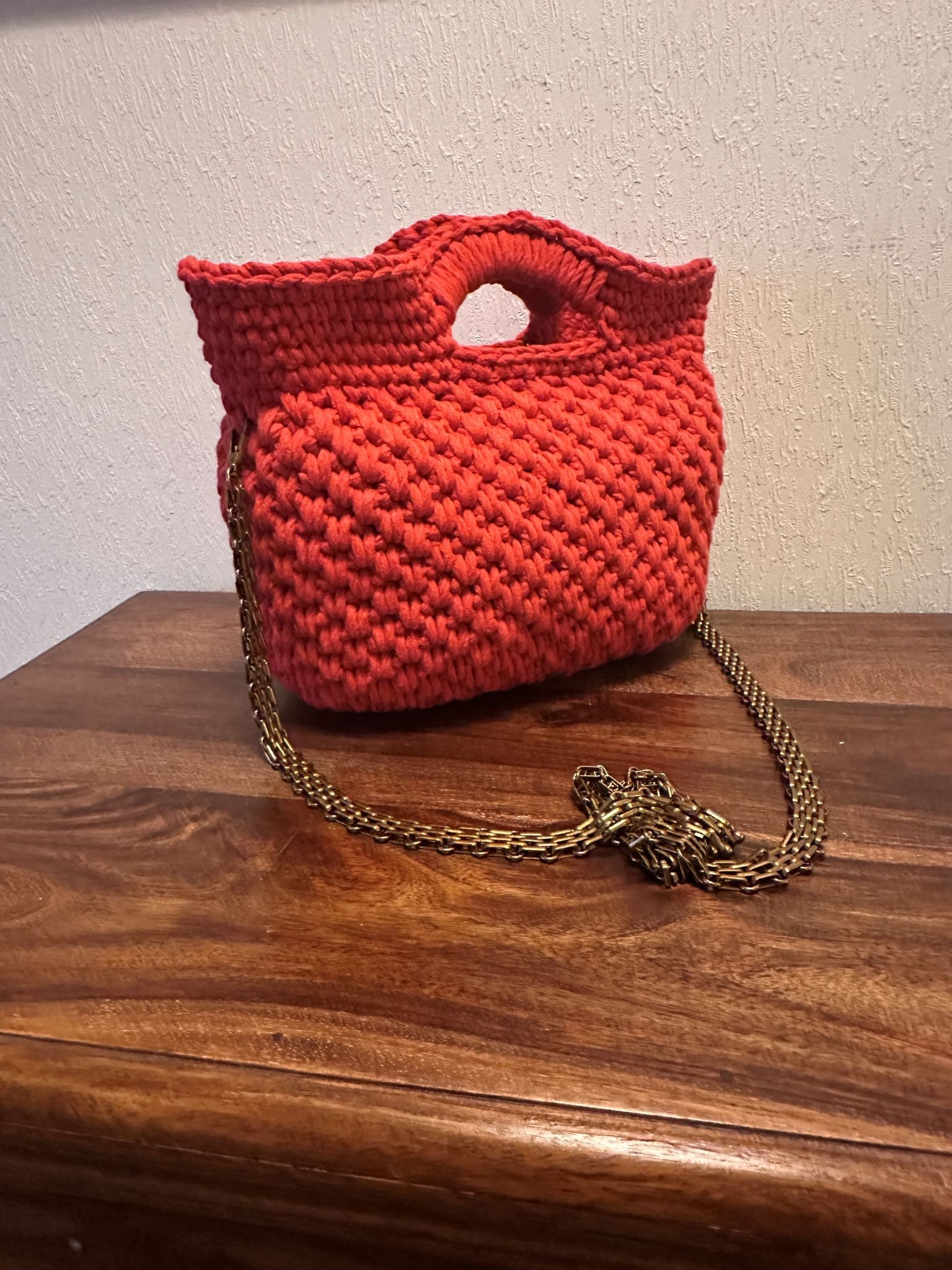 Oransje heklet veske med messinglenke