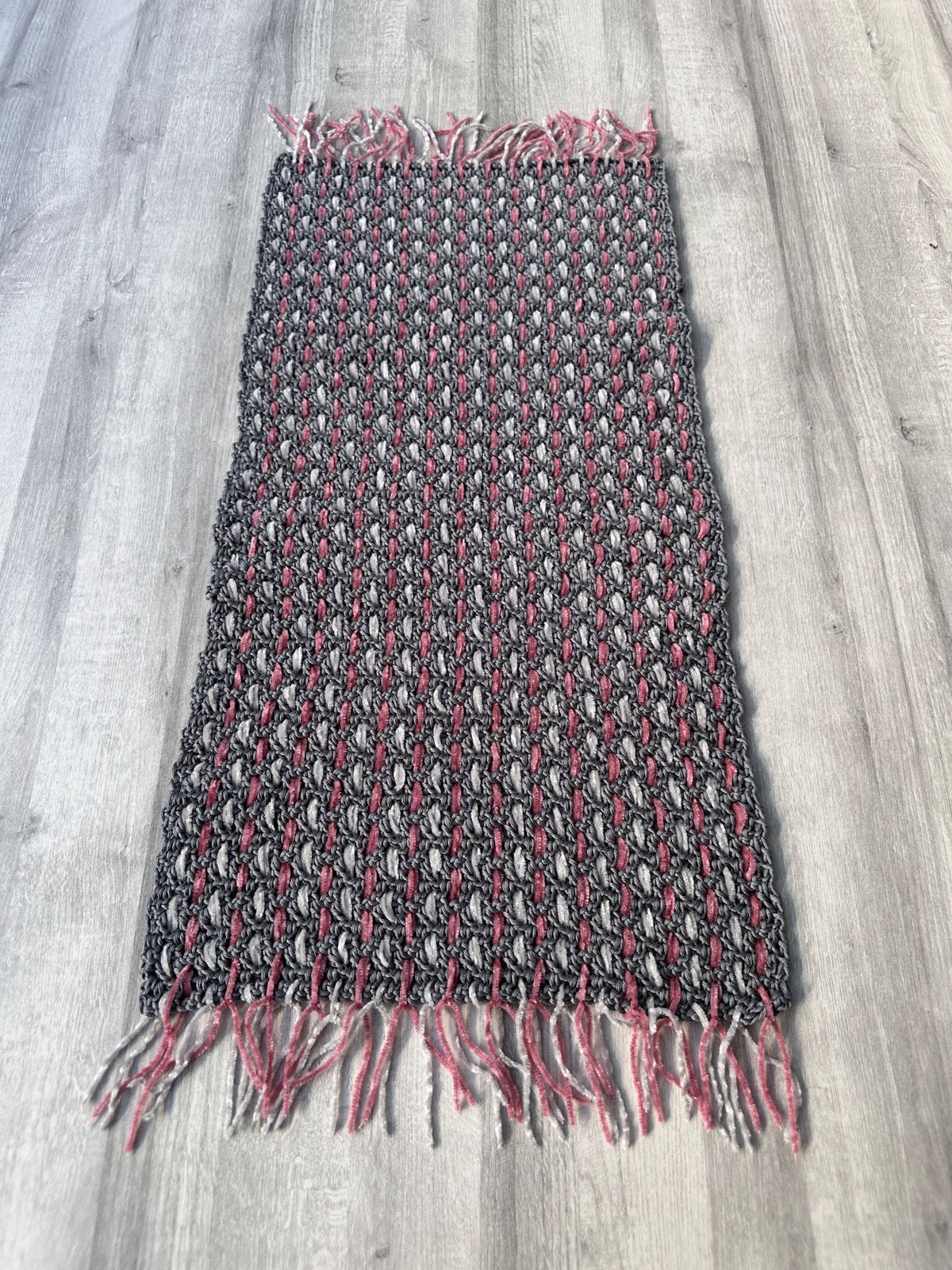 En løper som kombinerer tradisjonelt heklearbeid med moderne design, og gir hjemmet ditt et varmt og personlig preg.
