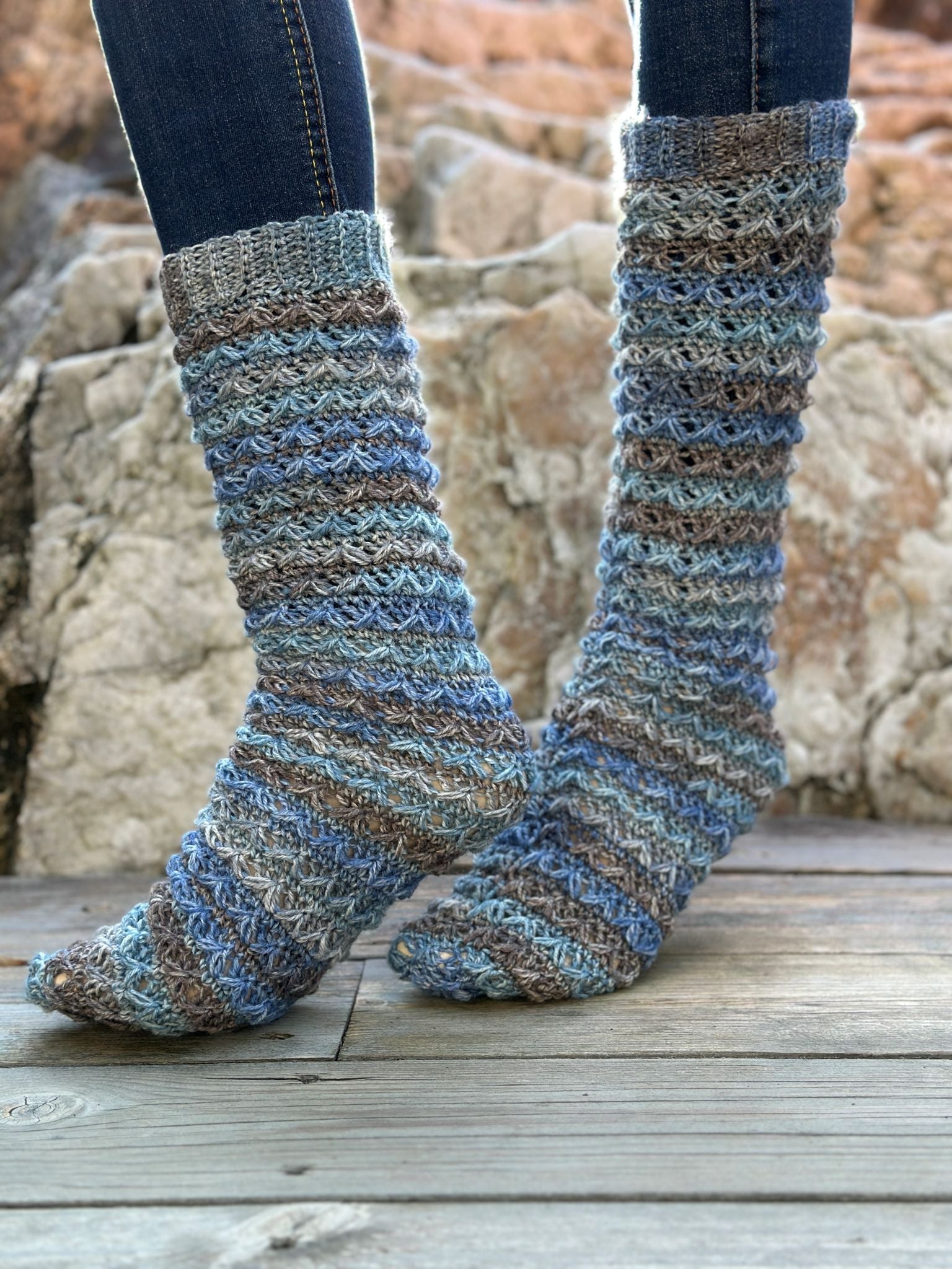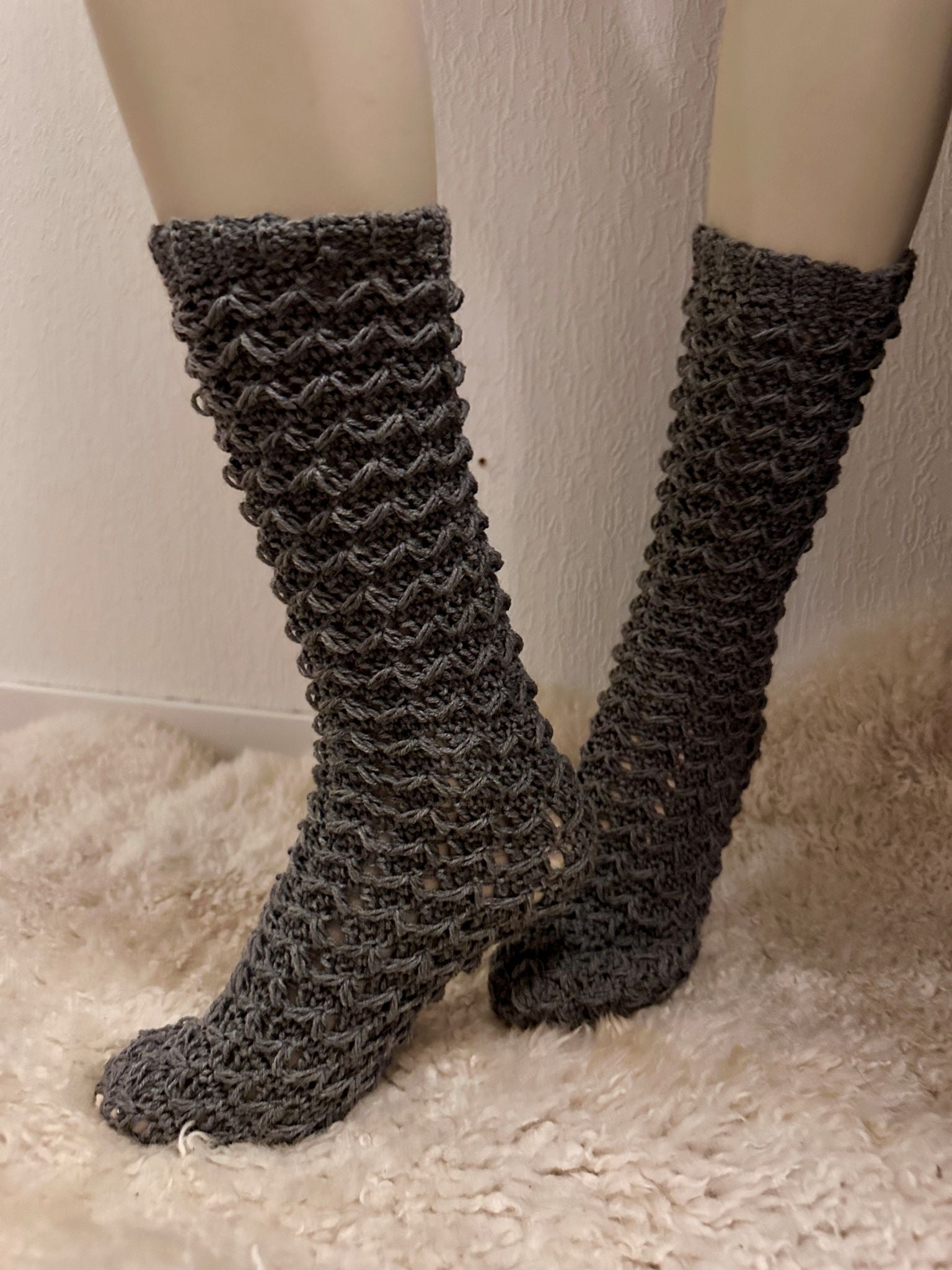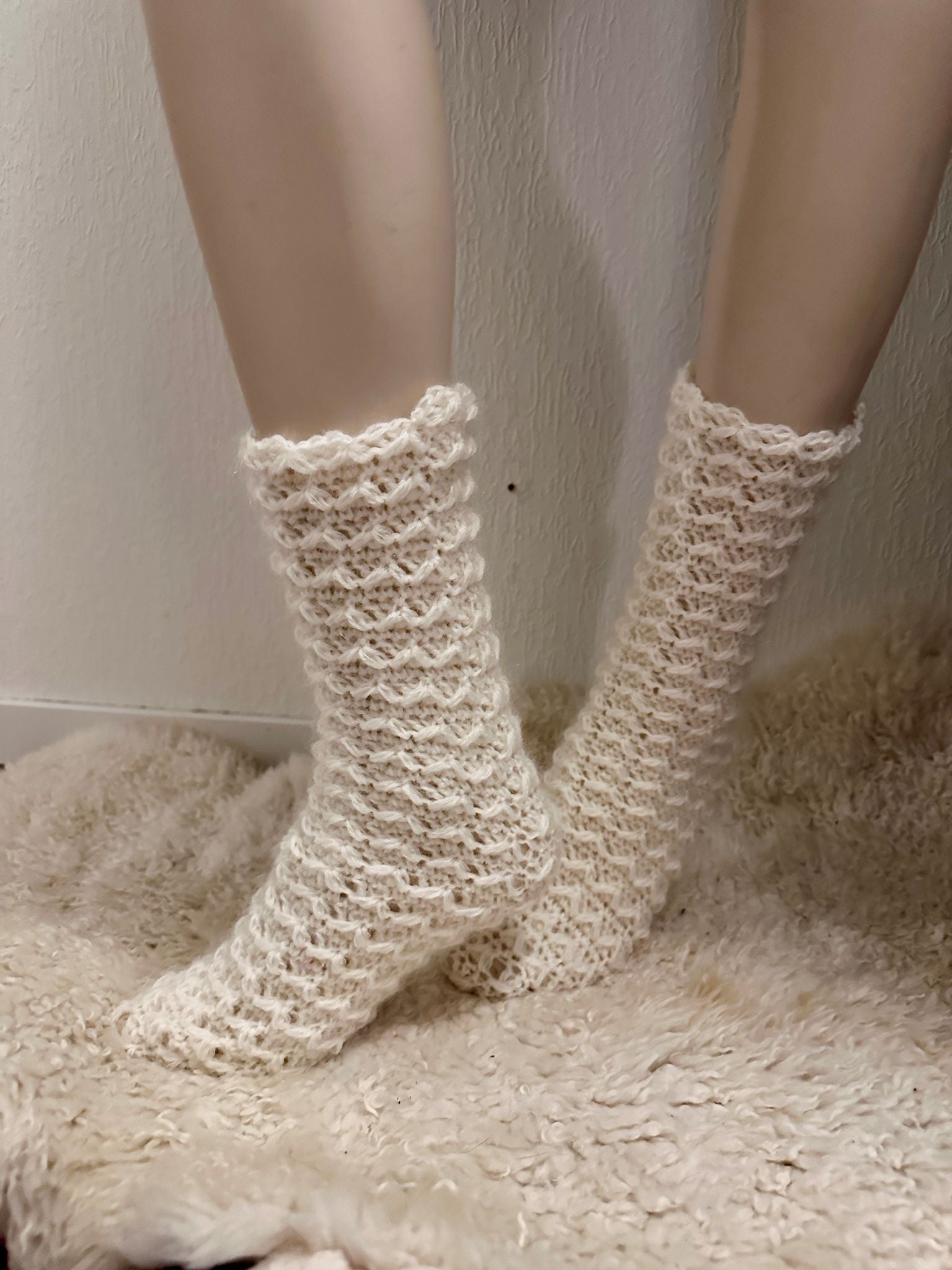 Disse strømpene kan tilpasses med annet garn for ulike størrelser, avhengig av garntykkelse. Lag dine egne Solbris nattstrømper for myk komfort på kjølige netter!