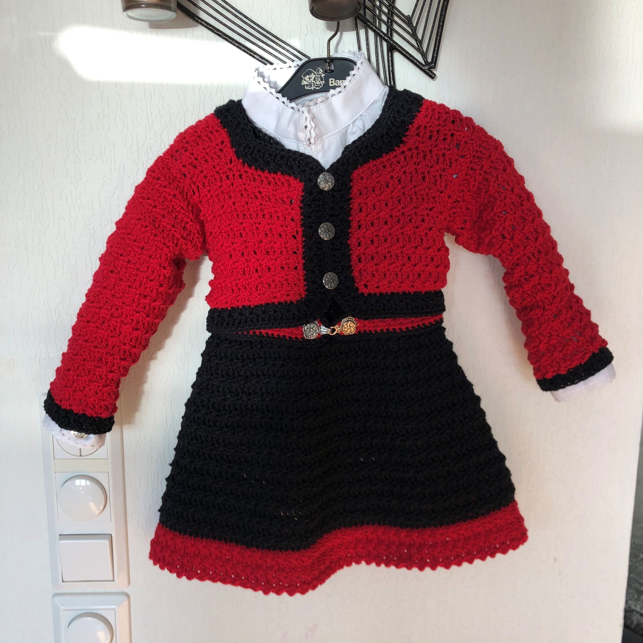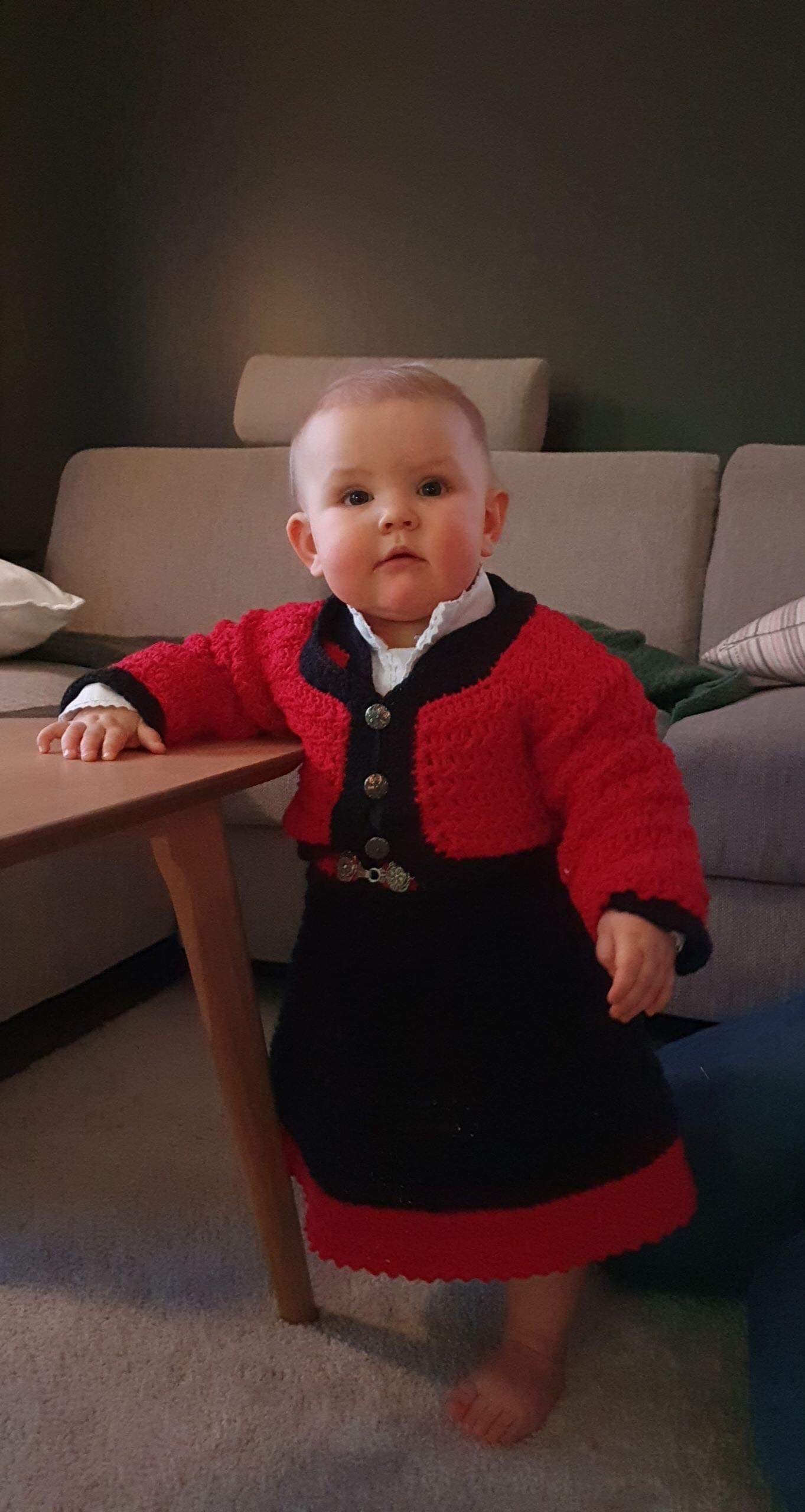 En nydelig heklet jakke som passer perfekt til barnefestdrakt eller bunad!